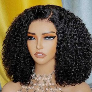 EveshairportCafe Glueless 5×5 Lace Closure Bob Deep Curly Wig Pre-Cut